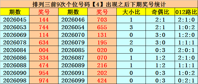 个位号码:上期奖号为小 号、偶数、1路号码:4,历史上个位号码4共开出839期,前一次出现在第2026098期,上期奖号为重号。